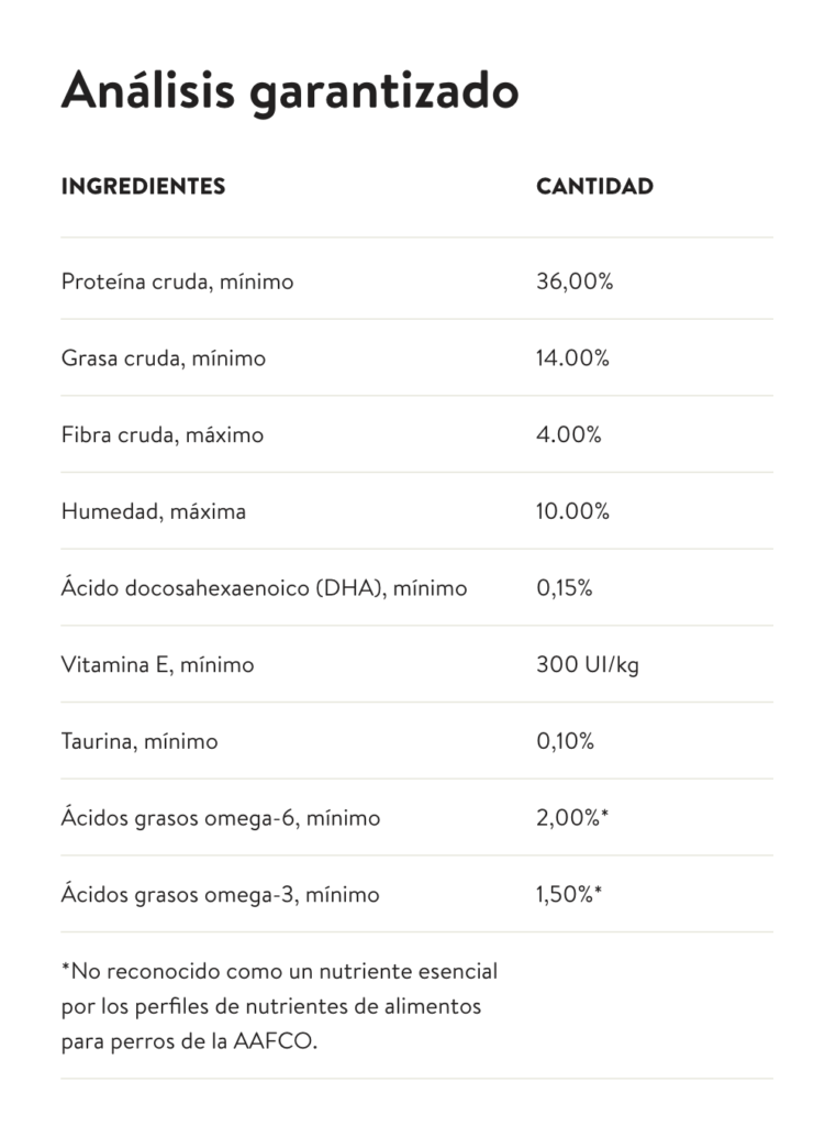 Energía metabolizable (calculada) 3.500 kcal/kg, 358 kcal/taza